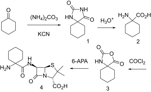 Reaction of cyclohexanone with ammonium carbonate and KCN under the conditions of the Bucherer-Bergs reaction led to hydantoin 1. On acid hydrolysis, α-amino acid 2 resulted. Treatment with phosgene both protected the amino group and activated the carboxyl group toward amide formation (as 3) and reaction with 6-aminopenicillanic acid (6-APA) gave cyclacillin (4).