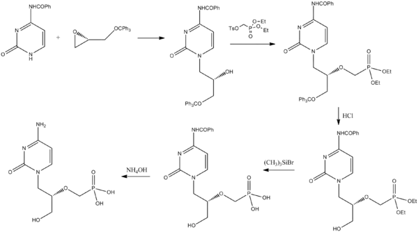 Cidofovir can be synthesized from a pyrimidone derivative and a protected derivative of glycidol.[28]