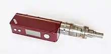 An electronic cigarette (commonly known as a vape) is a handheld battery-powered vaporizer that simulates smoking by providing some of the behavioral aspects of smoking, including the hand-to-mouth action of smoking, but without combusting tobacco.[48] Using an e-cigarette is known as "vaping" and the user is referred to as a "vaper" or “vapist”.[49] Instead of cigarette smoke, the user inhales an aerosol, commonly called vapor.[50] E-cigarettes typically have a heating element that atomizes a liquid solution called e-liquid.[51] E-cigarettes are automatically activated by taking a puff;[52] others turn on manually by pressing a button.[49] Some e-cigarettes look like traditional cigarettes,[53] but they come in many variations.[49] Most versions are reusable, though some are disposable.[54] There are first-generation,[55] second-generation,[56] third-generation,[57] and fourth-generation devices.[58] E-liquids usually contain propylene glycol, glycerin, nicotine, flavorings, additives, and differing amounts of contaminants.[59] E-liquids are also sold without propylene glycol,[60] nicotine,[61] or flavors.[62]