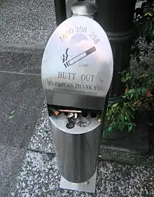 They are the most numerically frequent litter in the world.[44] Cigarette butts accumulate outside buildings, on parking lots, and streets where they can be transported through storm drains to streams, rivers, and beaches.[45] In a 2013 trial, the city of Vancouver, British Columbia, partnered with TerraCycle to create a system for recycling of cigarette butts. A reward of 1¢ per collected butt was offered to determine the effectiveness of a deposit system similar to that of beverage containers.[46][47]