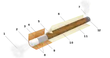 Manufacturers have described the cigarette as "a drug administration system for the delivery of nicotine in acceptable and attractive form".[28][29][30][31] Modern commercially manufactured cigarettes are seemingly simple objects consisting mainly of a tobacco blend, paper, PVA glue to bond the outer layer of paper together, and often also a cellulose acetate–based filter.[32] While the assembly of cigarettes is straightforward, much focus is given to the creation of each of the components, in particular the tobacco blend. A key ingredient that makes cigarettes more addictive is the inclusion of reconstituted tobacco, which has additives to make nicotine more volatile as the cigarette burns.[33]