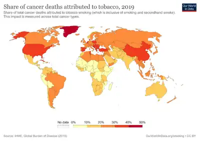 The WHO in 2004 projected 58.8 million deaths to occur globally,[66] from which 5.4 million are tobacco-attributed,[67] and 4.9 million as of 2007.[68] As of 2002, 70% of the deaths are in developing countries.[68] As of 2017, smoking causes one in ten deaths worldwide, with half of those deaths in the US, China, India and Russia.[69]