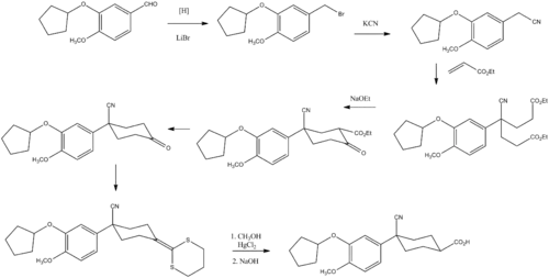 - ↑ Christensen SB, Guider A, Forster CJ, Gleason JG, Bender PE, Karpinski JM, et al. (March 1998). "1,4-Cyclohexanecarboxylates: potent and selective inhibitors of phosophodiesterase 4 for the treatment of asthma". Journal of Medicinal Chemistry. 41 (6): 821–35. doi:10.1021/jm970090r. PMID 9526558.