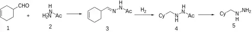 3-Cyclohexene-1-carbaldehyde [100-50-5] (aka 1,2,3,6-Tetrahydrobenzaldehyde) is reacted with N-acetylhydrazine to give the hydrazone, which is reduced by catalytic hydrogenation. The acetyl group is removed by acid hydrolysis.