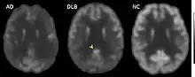 FDG-PET of horizontal cross section brain. Brighter areas indicate higher metabolism, and the cingulate island sign is present in DLB (arrow), unlike Alzheimer's disease (AD) and normal (NC). | |