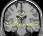 The cingulate sulcus is a sulcus (brain fold) on the cingulate cortex in the medial wall of the cerebral cortex. The frontal and parietal lobes are separated from the cingulate gyrus by the cingulate sulcus. It terminates as the marginal sulcus of the cingulate sulcus. It sends a ramus to separate the paracentral lobule from the frontal gyri, the paracentral sulcus.