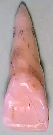 Lingual (interior) view of an upper incisor. The cingulum is highlighted near the base.