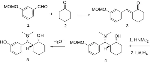 The Claisen-Schmidt condensation between 3-(methoxymethoxy)benzaldehyde [13709-05-2] (1) and cyclohexanone (2) afforded CID:54364197 (3). Michael addition of dimethylamine leads the aminoketone, i.e. 2-[dimethylamino-[3-(methoxymethoxy)phenyl]methyl]cyclohexan-1-one, CID21518320. Reduction of the ketone proceeds stereospecifically to afford the cis aminoalcohol [51356-58-2] (4). Mild hydrolysis of the product gives the free phenol ciramadol (5).