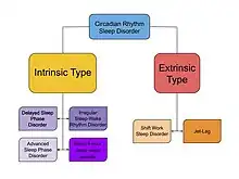 CRSDs can be categorized into two groups based on their underlying mechanisms: The first category is composed of disorders where the endogenous oscillator has been altered, known as intrinsic type disorders. The second category consists of disorders in which the external environment and the endogenous circadian clock are misaligned, called extrinsic type CRSDs.[16]