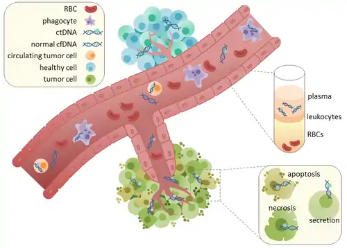 - ↑ Qin Z, Ljubimov VA, Zhou C, Tong Y, Liang J (April 2016). "Cell-free circulating tumor DNA in cancer". Chinese Journal of Cancer. 35: 36. doi:10.1186/s40880-016-0092-4. PMC 4823888. PMID 27056366.