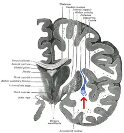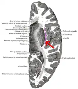 ![]() Transverse section of human cerebrum. The claustrum is indicated by the arrow. | |