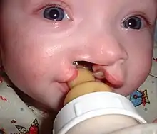 Cleft lip and cleft palate, also known as orofacial cleft, is a group of conditions that includes cleft lip, cleft palate, and both together.[1][2] A cleft lip contains an opening in the upper lip that may extend into the nose.[1] The opening may be on one side, both sides, or in the middle.[1] A cleft palate occurs when the roof of the mouth contains an opening into the nose.[1] These disorders can result in feeding problems, speech problems, hearing problems, and frequent ear infections.[1] Less than half the time the condition is associated with other disorders.[1]