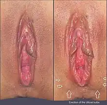 During sexual arousal, arterial blood flow to the clitoris is increased, and within the clitoris, the arteries further branch to supply the erectile tissues. The trabecular smooth muscles of the erectile tissue relax increasing blood flow to fill the vascular spaces, and expanding the erectile tissues until they are fully engorged with blood.[7] The ischiocavernosus and bulbocavernosus muscles contract, compressing the dorsal vein of the clitoris. This compression of the vein restricts drainage of the erectile structures, trapping the blood.[8] This process stretches the tunica albuginea. As a result, the clitoris becomes tumescent to accommodate the increased intracavernosous pressure. The tunica albuginea of the clitoris is made up of one layer making it more elastic than the tunica albuginea of the penis, which is composed of two layers.[9] Erick Janssen (2007) elaborates on this reporting that "the corpora cavernosa of the clitoris are essentially similar to that of the penis except that there is no subalbugineal layer interposed between the tunica albuginea and the erectile tissue. In the penis, this[10] tissue engorges with blood during sexual arousal and becomes compressed against the unyielding tunica, creating penile rigidity – a true erection. The lack of this plexus in the clitoris indicates that while the organ can become tumescent or engorged, it cannot, like the penis, become stiffly erect. The clitoris thus does not become erect with sexual excitement, but engorged."[10] In addition, the tunica albuginea around the glans is thinner than around the shaft in both the clitoris and penis. This gives the glans less firmness relative to the shaft. The extrusion of the glans clitoridis and thinning of the skin enhances sensitivity to physical contact. After a female has orgasmed, the erection usually ends, but this may take time.