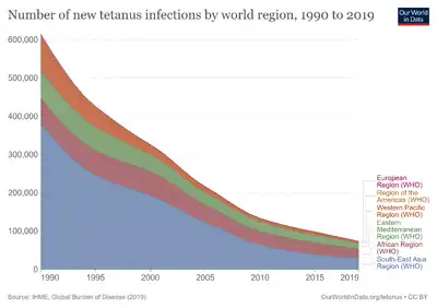 Clinical descriptions of tetanus associated with wounds are found at least as far back as the 4th century BCE, in Hippocrates' Aphorisms.[8] The first clear connection to the soil was in 1884, when Arthur Nicolaier showed that animals injected with soil samples would develop tetanus.[6] In 1889, C. tetani was isolated from a human victim by Kitasato Shibasaburō, who later showed that the organism could produce disease when injected into animals, and that the toxin could be neutralized by specific antibodies. In 1897, Edmond Nocard showed that tetanus antitoxin induced passive immunity in humans, and could be used for prophylaxis and treatment.[6] In World War I, injection of tetanus antiserum from horses was widely used as a prophylaxis against tetanus in wounded soldiers, leading to a dramatic decrease in tetanus cases over the course of the war.[9] The modern method of inactivating tetanus toxin with formaldehyde was developed by Gaston Ramon in the 1920s; this led to the development of the tetanus toxoid vaccine by P. Descombey in 1924, which was widely used to prevent tetanus induced by battle wounds during World War II.[6]