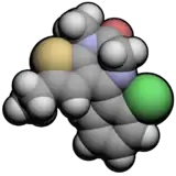 Clotiazepam[3] (marketed under brand name Clozan, Distensan, Trecalmo, Rize, Rizen and Veratran) is a thienodiazepine drug which is a benzodiazepine analog. The clotiazepam molecule differs from benzodiazepines in that the benzene ring has been replaced by a thiophene ring.[4] It possesses anxiolytic,[5] skeletal muscle relaxant,[6] anticonvulsant, sedative properties.[7] Stage 2 NREM sleep is significantly increased by clotiazepam.[8]