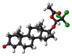 Cloxotestosterone acetate (INNTooltip International Nonproprietary Name; brand name Caprosem), also known as testosterone 17β-chloral hemiacetal O-acetate, is a synthetic, injected anabolic–androgenic steroid (AAS) and an androgen ether and ester – specifically, the O-acetate ester of cloxotestosterone, the 17β-trichloro hemiacetal ether of testosterone.[1] It is administered via intramuscular injection, as a 100 mg, 2 mL aqueous suspension and lasts 4 to 6 weeks with a single administration.[2] The drug was first marketed in the early 1960s.[2]
