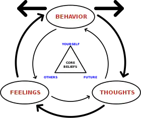 The triangle in the middle represents CBT's tenet that all humans' core beliefs can be summed up in three categories: self, others, future.