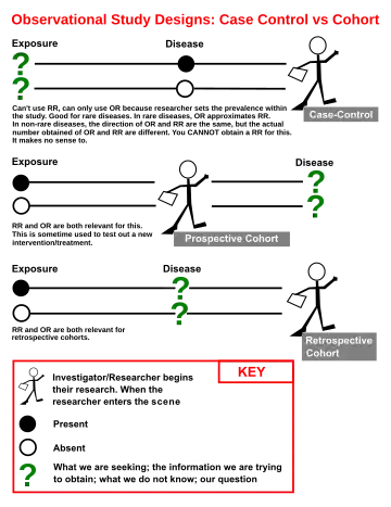 The diagram indicates the starting point and direction of cohort and case-control studies. In case-control studies the analysis proceeds from documented disease and investigations are made to arrive at the possible causes of the disease. In cohort studies the assessment starts with the putative cause of disease, and observations are made of the occurrence of disease relative to the hypothesized causal agent.[11]