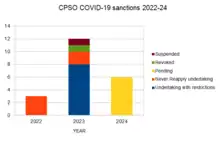 The fourth category, appearing for the first time in 2022, is for COVID-19 related undertakings. Since the start of the COVID-19 pandemic, the CPSO has required physicians not to "disseminate false and misleading information" about COVID-19, which may include the physicians' personal opinions about mask wearing, vaccine safety and the effectiveness of certain COVID treatments. Several physicians have been disciplined for allegedly failing to comply with these guidelines, including five to date who have signed "never reapply" undertakings.