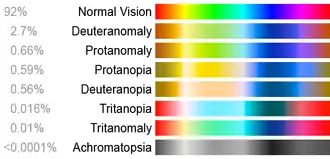 • Deuteranopia affects hue discrimination in a similar way to protanopia, but without the dimming effect. Again, it is found in about 1% of the male population.[15]