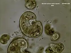- Large Colpoda amongst many smaller ones with other ciliates 100X