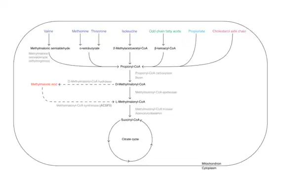 Methylmalonic acid is formed from the essential amino acids valine, methionine, threonine and isoleucine, from odd-chained fatty acids, from propionate and from cholesterol side chain, on the degradation path into the citrate cycle. In this process, the last intermediate methylmalony-CoA can be converted to methymalonic acid by a deacylase before incorporation at the succinyl-CoA site of the citrate cycle. At this point, the acyl-CoA synthease encoded by ACSF3 could convert the methylmalonic acid back to methylmalonyl-CoA and then feed it to the citrate cycle with the help of the methylmalonyl-CoA mutase and its cofactor vitamin B12. However, intracellular esterases are also capable of cleaving the methyl group of methylmalonic acid and generating the parent molecule malonic acid.[13]