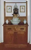 Another meaning attested is a washstand, a piece of furniture equipped with basin, jug, and towel rail, and often with space to store the chamber pot behind closed doors. A washstand in the bedroom pre-dates indoor bathrooms and running water.