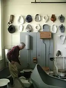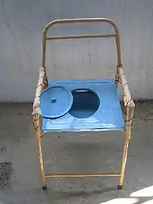 In British English, "commode" is the standard term for a commode chair, often on wheels, enclosing a chamber pot—as used in hospitals and assisted living homes.[1] In the United States, a "commode" is now a colloquial synonym for a flush toilet.[2]
