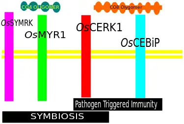 Myc-factor receptor (MFR) is still putative. However, a protein called DMI2 (or SYMRK) has a prominent role in perception process and it is thought to be a co-receptor of MFR. Other plants such as rice may employ different mechanisms using OsCERK1 and OsCEBiP to detect chitin oligomers.[2][14][15] However, recent work has demonstrated that rice SYMRK is essential for AM symbiosis.[16]