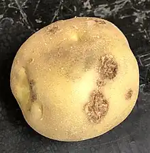 Common scab is a plant disease of root and tuber crops caused by a small number of Streptomyces species, specifically S. scabies, S. acidiscabies, S. turgidiscabies and others. Common scab mainly affects potato (Solanum tuberosum), but can also cause disease on radish (Raphanus sativus), parsnip (Pastinaca sativa), beet (Beta vulgaris), and carrot (Daucus carota). This plant disease is found wherever these vegetables are grown.[1]