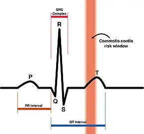 The deviation of commotio cordis from the normal electrical rhythm of the heart is assessed scientifically in laboratory studies by analysis of the electrocardiograph (ECG) T wave (see ECG image).[1] Only chest impacts occurring on a narrow band of the ECG during the upslope of the T wave (40 milliseconds (ms) before the peak of the T wave to the instant of the actual peak) will cause the ventricular fibrillation of commotio cordis, with an increased probability occurring when an impact happens from 30 to 10 ms before the peak of the T wave.[1]