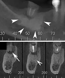 Cone beam CT scan presenting a diffuse hyperdense lesion in the apex of a mandibular molar (arrowhead, top) adjacent to an inflammatory periapical lesion (arrow, bottom).[1] | |