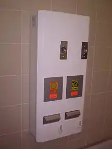 A condom machine is a vending machine for the sale of condoms. Condom machines are often placed in public toilets, subway stations, railway stations and airports as a public health measure to promote safe sex. Many pharmacies also keep one outside, for after-hours access. Rare examples exist that dispense internal condoms.[1]