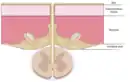 During normal development, cutaneous ectoderm separates from neuroectoderm to allow for the insertion of mesoderm.[3] That is, the skin separates from the tissue of the spinal cord to allow proper formation of the vertebral column.[3] In cases of congenital dermal sinus there is a failure in this process, resulting in formation of a persistent connection between the skin and neural tissue.[3] This manifests as a tract extending from the surface of the skin to the spinal cord lined with stratified squamous epithelium, surrounded by dermal and neurological tissue.[3][5] The tract may terminate in the deep fascia, or even make contact with neural elements.[2] Congenital dermal sinus may form at any point along the midline of the neuraxis, however, the majority form in the lumbar and lumbosacral region (41% and 35% of cases respectively).[3]