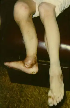 Charcot joints are shown in this boy with CIPA. His right knee and right ankle are enlarged and distorted. The skin over the medial aspect of the ankle is darkened with a draining wound secondary to superimposed osteomyelitis. There are other areas of trauma and ulcers including a site on the right heel. | |