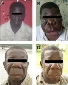 Conidiobolomycosis: Reddish hard swelling over the lower half of face with thickening of the lower lip | |
