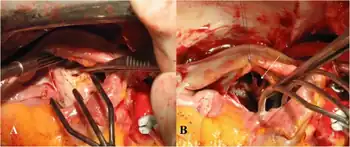 a) Calcification of a cor triatriatum membrane arrow b) after balloon dilatation, a tear of 3 mm in membrane was created arrow | |