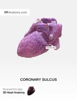 The coronary sulcus (also called coronary groove, auriculoventricular groove, atrioventricular groove, AV groove) is a groove on the surface of the heart at the base of right auricle that separates the atria from the ventricles.[1][2] The structure contains the trunks of the nutrient vessels of the heart,[2] and is deficient in front, where it is crossed by the root of the pulmonary trunk. On the posterior surface of the heart, the coronary sulcus contains the coronary sinus.[3] The right coronary artery, circumflex branch of left coronary artery, and small cardiac vein all travel along parts of the coronary sulcus.