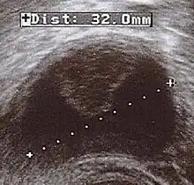 Corpus luteum cyst with bleeding. Fresh blood is anechoic (black). A protrusion of coagulated blood (lighter in color) can also be seen in the top of the cyst. | |