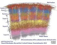 A cortical column is a group of neurons forming a cylindrical structure through the cerebral cortex of the brain perpendicular to the cortical surface.[1] The structure was first identified by Mountcastle in 1957. He later identified minicolumns as the basic units of the neocortex which were arranged into columns.[2] Each contains the same types of neurons, connectivity, and firing properties.[3] Columns are also called hypercolumn, macrocolumn,[4] functional column[5] or sometimes cortical module.[6] Neurons within a minicolumn (microcolumn) encode similar features, whereas a hypercolumn "denotes a unit containing a full set of values for any given set of receptive field parameters".[7] A cortical module is defined as either synonymous with a hypercolumn (Mountcastle) or as a tissue block of multiple overlapping hypercolumns.[8]
