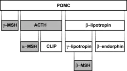 3. 1 2 Rousseau K, Kauser S, Pritchard LE, Warhurst A, Oliver RL, Slominski A, Wei ET, Thody AJ, Tobin DJ, White A (June 2007). "Proopiomelanocortin (POMC), the ACTH/melanocortin precursor, is secreted by human epidermal keratinocytes and melanocytes and stimulates melanogenesis". FASEB Journal. 21 (8): 1844–56. doi:10.1096/fj.06-7398com. PMC 2253185. PMID 17317724.