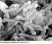 A corynebacteriophage (or just corynephage) is a DNA-containing bacteriophage specific for bacteria of genus Corynebacterium as its host.[1] Corynebacterium diphtheriae virus[2] strain Corynebacterium diphtheriae phage[2] (aka Corynephage β[3] or just β-phage[4][5]) introduces toxigenicity into strains of Corynebacterium diphtheriae as it encodes diphtheria toxin,[6][7][8][5][4] it has subtypes beta c and beta vir.[9] According to proposed taxonomic classification, corynephages β and ω are unclassified members of the genus Lambdavirus, family Siphoviridae.[3][10]