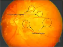 - 1 2 3 4 Gomez ML, Mojana F, Bartsch DU, Freeman WR (December 2009). "Imaging of long-term retinal damage after resolved cotton wool spots". Ophthalmology. 116 (12): 2407–2414. doi:10.1016/j.ophtha.2009.05.012. PMC 4172325. PMID 19815278.