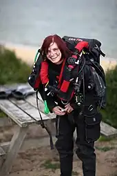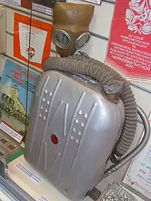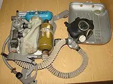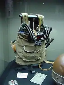 During the Second World War, captured Italian frogmen's rebreathers influenced improved designs for British rebreathers.[40] Many British frogmen's breathing sets used aircrew breathing oxygen cylinders salvaged from shot-down German Luftwaffe aircraft. The earliest of these breathing sets may have been modified Davis Submerged Escape Apparatus; their fullface masks were the type intended for the Siebe Gorman Salvus, but in later operations different designs were used, leading to a fullface mask with one big face window, at first circular or oval and later rectangular (mostly flat, but the sides curved back to allow better vision sideways). Early British frogman's rebreathers had rectangular counterlungs on the chest like Italian frogman's rebreathers, but later designs had a square recess in the top of the counterlung so it could extend further up toward the shoulders. In front they had a rubber collar that was clamped around the absorbent canister.[40] Some British armed forces divers used bulky thick diving suits called Sladen suits; one version of it had a flip-up single faceplate for both eyes to let the user get binoculars to his eyes when on the surface.