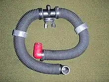 A breathing hose or sometimes breathing tube on a rebreather is a flexible tube for breathing gas to pass through at ambient pressure. They are distinguished from the low-, intermediate-, and high-pressure hoses which may also be parts of rebreather apparatus. They have a wide enough bore to minimise flow resistance at the ambient pressure in the operational range for the equipment, are usually circular in cross section, and may be corrugated to let the user's head move about without the tube collapsing at kinks.[6]