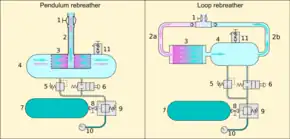 There are two basic arrangements controlling the flow of breathing gas inside the rebreather, known as the pendulum and loop systems.