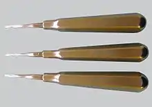 Coupland's elevators (also known as chisels)[1][2] are instruments commonly used for dental extraction. They are used in sets of three each of increasing size and are used to split multi-rooted teeth and are inserted between the bone and tooth roots and rotated to elevate them out of the sockets.[3] The instruments were designed by Dr Douglas C W Coupland who qualified as a dental surgeon in Toronto in 1922 and spent most of his career practising dentistry in Ottawa where he specialised in dental extraction.[4] Coupland designed the instruments in the 1920s; they were manufactured by the Hu-Friedy company and sold from the early 1930s initially as sets of eight or twelve which were later reduced to three.[2] Coupland also designed a set of dental suckers with interchangeable tips.[2]