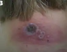 Cowpox lesions on forearm on day 7 after onset of illness.[1] | |