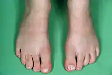 Picture of longitudinal ridging and splitting of the toenails as part of craniofrontonasal dysplasia.