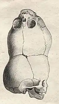 Drawing of a skull of a child born in 1783 in Bengal, affected by craniopagus parasiticus |
